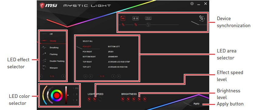 - LED control software provided by MSI allows users to choose from various lighting effects.